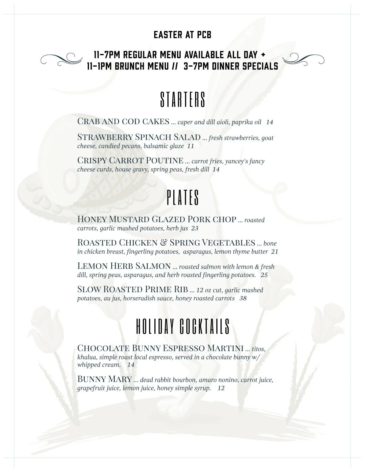 Easter brunch/dinner Sunday, April 5, 2026 11:00 AM 7:00 PM Prison City Pub 28 State Street Auburn, NY, 13021 United States (map) Google Calendar ICS Make Reservations Online
