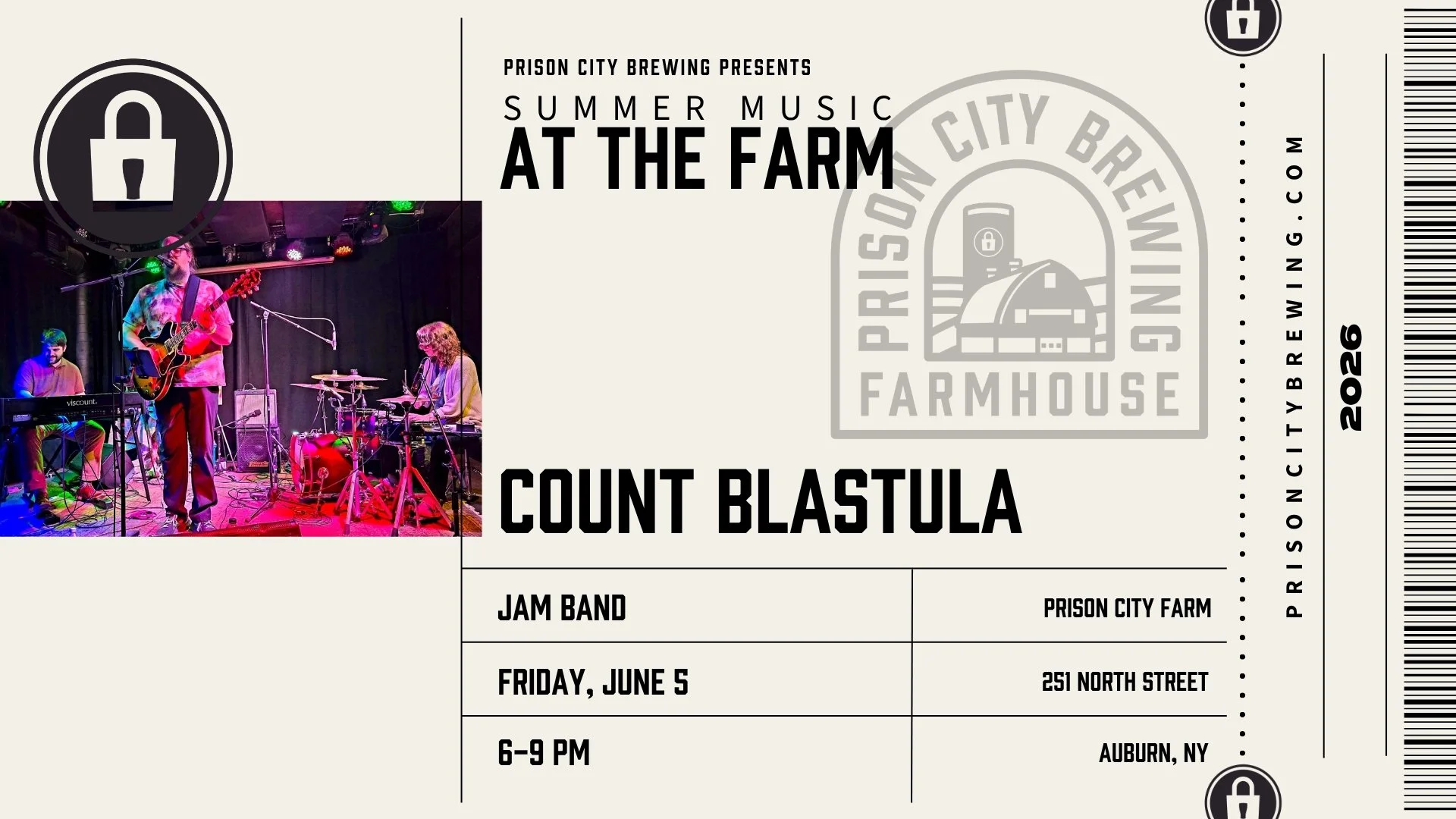 Back to All Events Count Blastula Friday, June 5, 2026 6:00 PM 9:00 PM Prison City North St. Farm 251 North Street Auburn, NY, 13021 United States (map) Google Calendar ICS summer music at the farm summer music at the farm