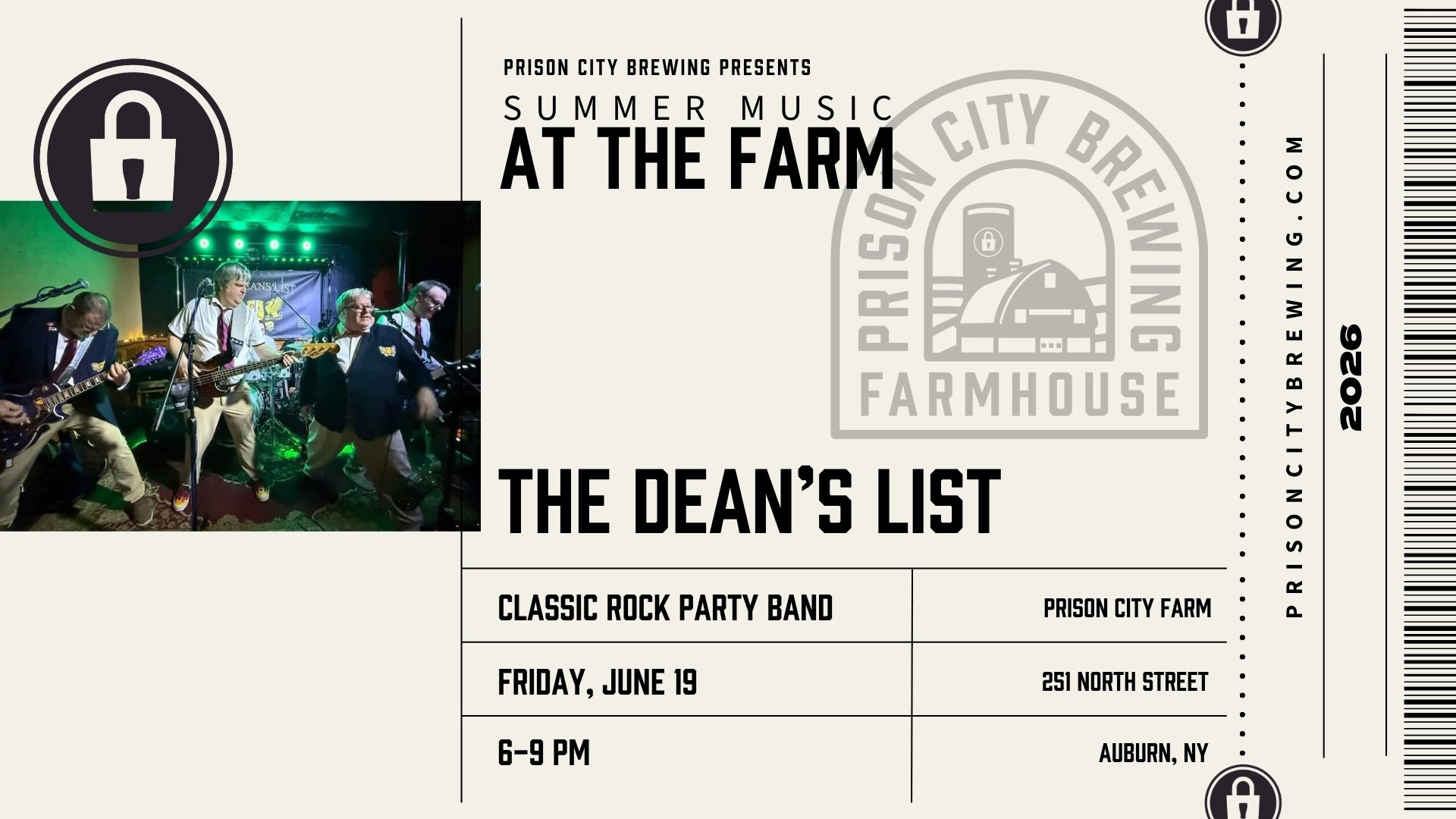 Back to All Events The Dean’s List Friday, June 19, 2026 6:00 PM 9:00 PM Prison City North St. Farm 251 North Street Auburn, NY, 13021 United States (map) Google Calendar ICS summer music at the farm summer music at the farm